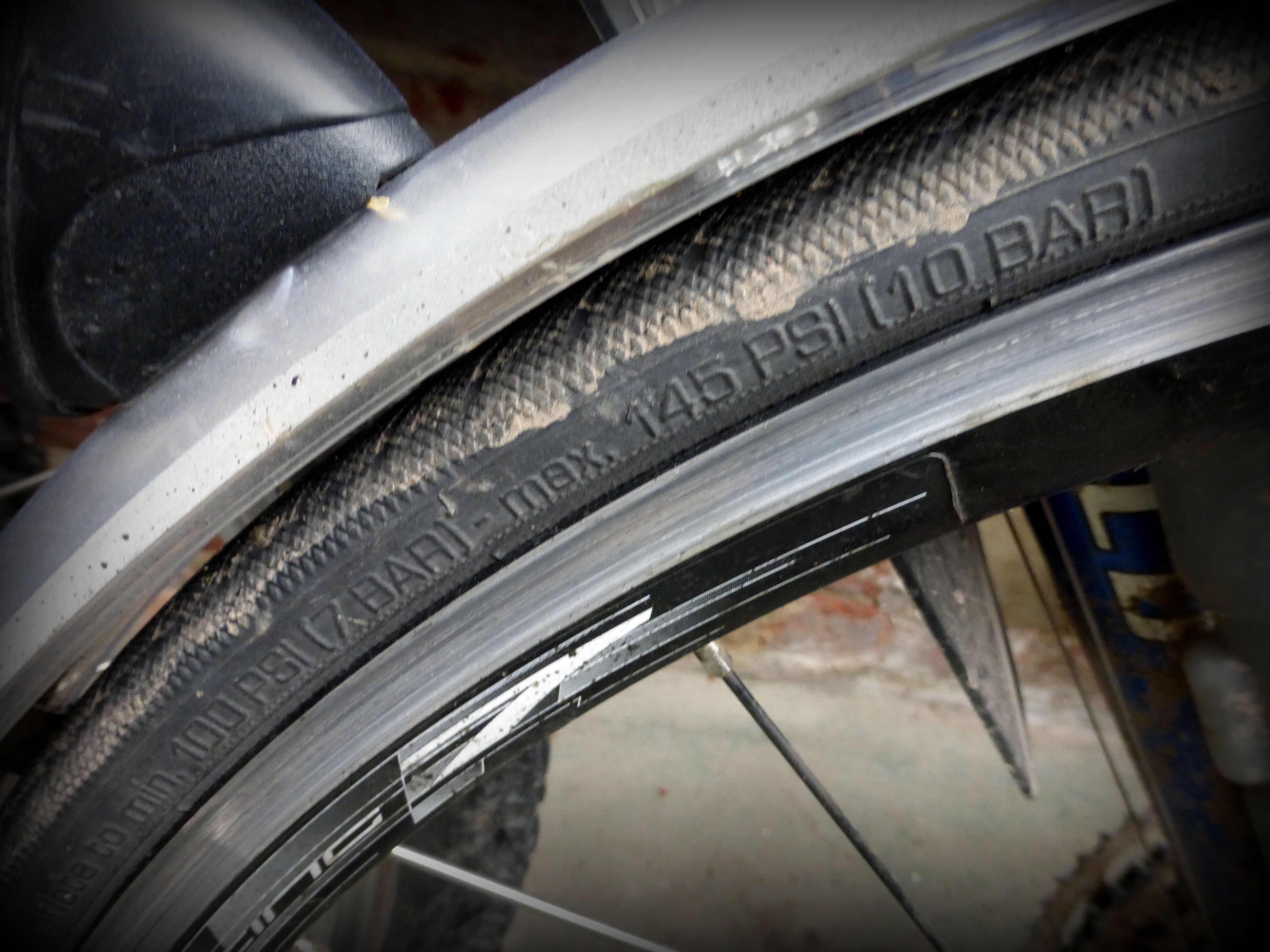 All tyres will have, somewhere on them, a recommended pressure, expressed in two different units: PSI and bar. Unfortunately this vital information is usually embossed onto the rubber rather than printed clearly, so you’ll often have to wipe down the tyre and peer at it intensely while shining a torch on it at different angles and muttering “this is ridiculous, I know it’s on here somewhere”. Some will give maximum and minimum values, others just a maximum. As a rule of thumb, for riding on the road you should make sure your tyre is at the “recommended” pressure, or if there isn’t one, within 10 PSI of the maximum. For comfort and efficiency, the best pressure will vary depending on how bumpy the road is and how much you weigh, but for puncture avoidance, you need it pumped up hard.